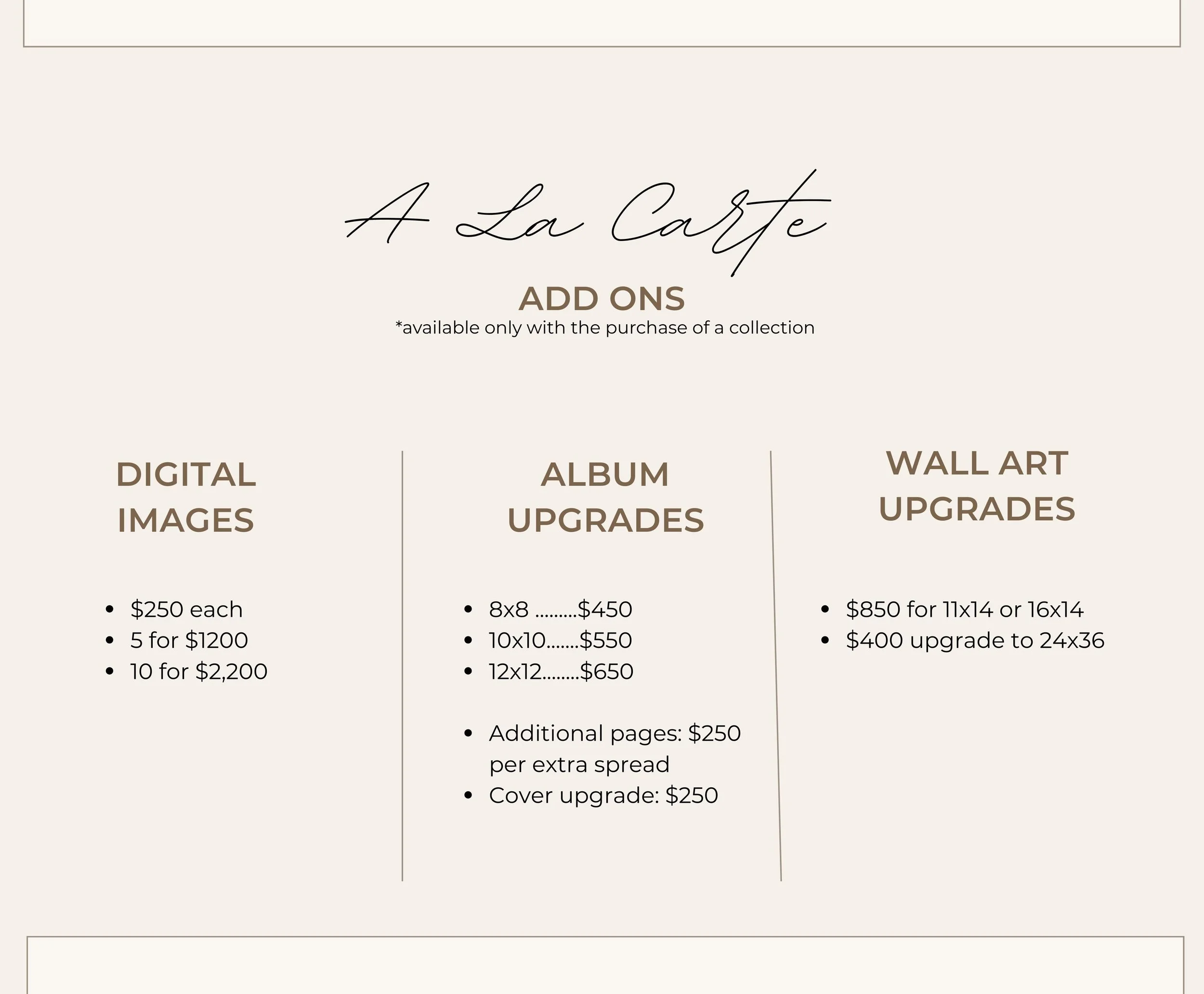 The session fee of $450 (or $550 for couples) is the only payment due at the time of booking. Product selections are made later, during your reveal appointment, once you’ve seen your images and explored our curated product samples in the studio or online.